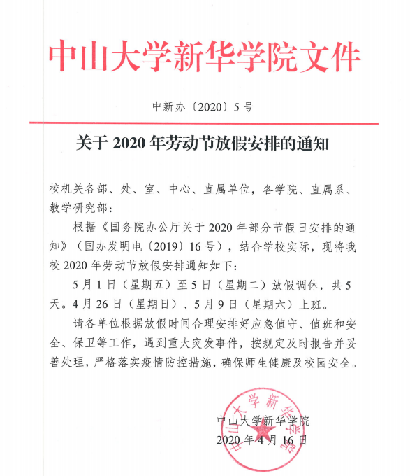 关于2020年劳动节放假安排的通知