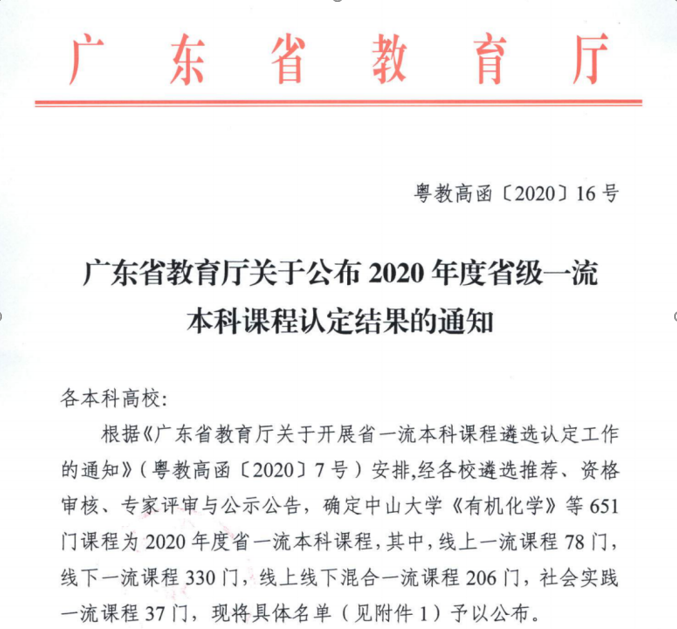 据悉,此次广东省公布的一流本科课程共651门,包括线上一流本科课程78门,线上线下混合一流课程206门,线下一流课程330门,社会实践一流课程37门。