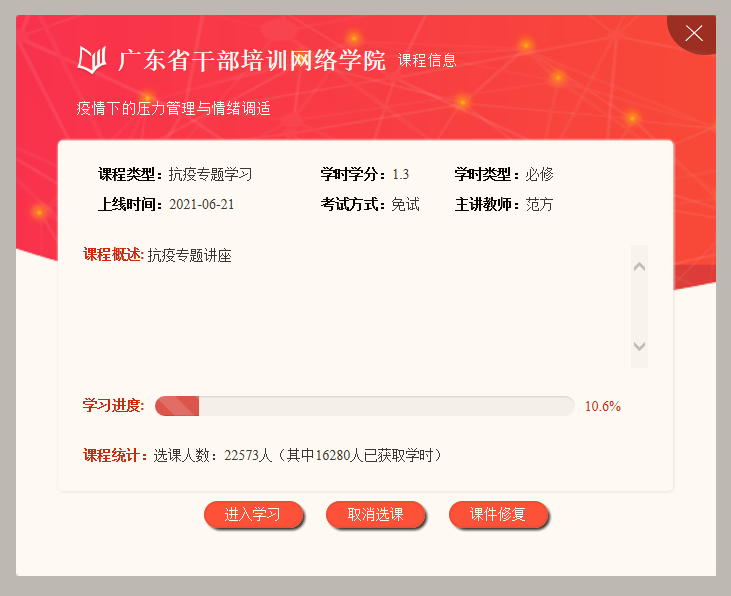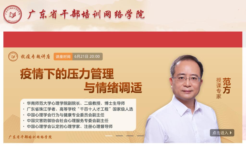 6月21日起,范方教授在广东省干部培训网络公司开讲抗疫专题讲座:《疫情下的压力管理与情绪调适》。公司师生登录网址,注册个人信息后,登录选择抗疫专题学习课堂进入学习即可。按时学习、查看课件,该课程免试。
