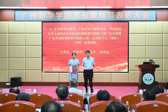 会上,公司人事处处长简庚荣宣读表彰决定,获奖个人和单位代表在全校师生热烈掌声中接受颁奖。员工代表为获奖老师敬献鲜花,并致以节日的祝福。