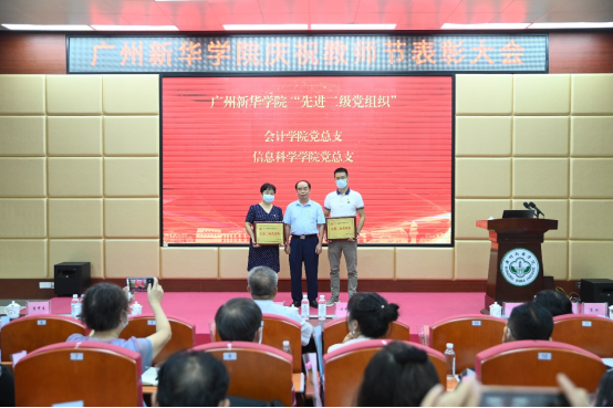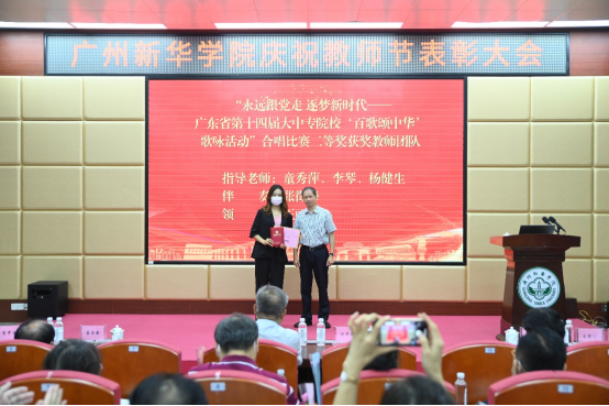 王庭槐董事长、周云书记为"永远跟党走 逐梦新时代——广东省第十四届大中专院校'百歌松中华'歌咏活动"歌手大赛一等奖获奖教师颁奖