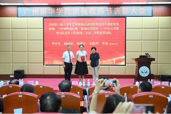 王庭槐董事长、周云书记为全国第六届老员工艺术展演活动高校美育改革创新优秀案例二等奖团队教师代表颁奖