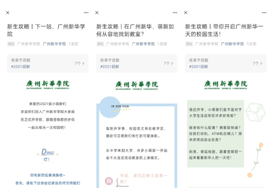 此外,公司各校级网络媒体平台纷纷利用网络信息技术手段,线上线下联动打造热烈迎新氛围。“广州新华2021级新生报到流程、接送服务指南”“智能水表使用指南”以及包含衣食住行的“新生攻略”系列推文,帮助新生“人未到,心已至”,提前了解校园生活。