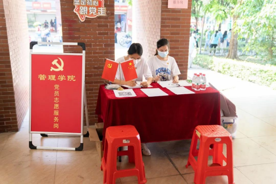 为充分发挥共产党员的先锋模范作用,贯彻践行“我为群众办实事”的号召,引导新生积极向党组织靠拢,经济与贸易公司和管理公司等院系党总支在报到点特别设立“党员服务岗”,为新生提供入党咨询及答疑服务,并协助报到处的师生完成新生入学报到等事宜,前往新生宿舍协助其解决内务等问题。