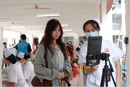 各院系迎新服务点增设人脸识别系统进行身份验证和信息录入,打通线上线下新生报到程序,大大地节约了排队的时间,提高办理效率,助力校园疫情防控。
