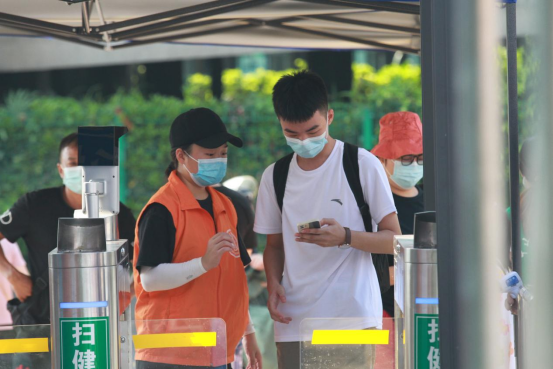 2021级新生在志愿者查看48小时核酸检测阴性证明、粤康码绿码、行程卡后,扫ixh健康码,测温正常后进入校园