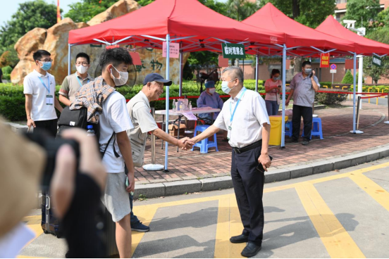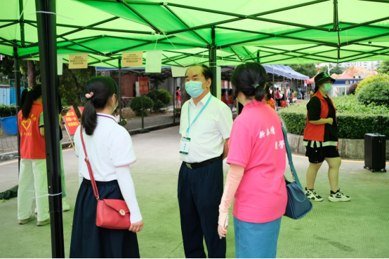 王庭槐董事长(上图右一,下图左二)在校门口临时观察点与报到点指导工作