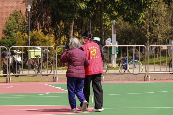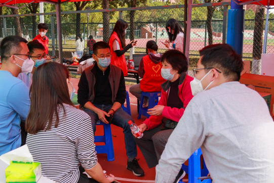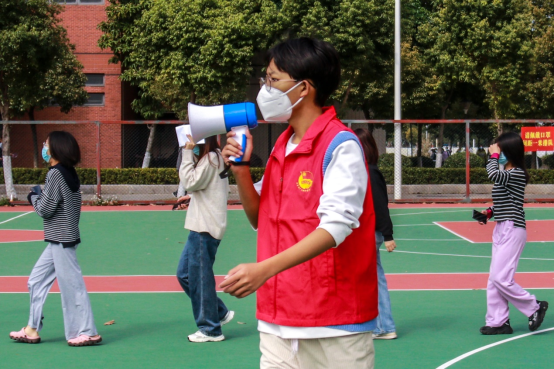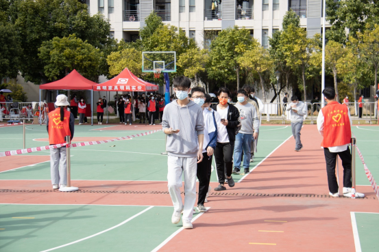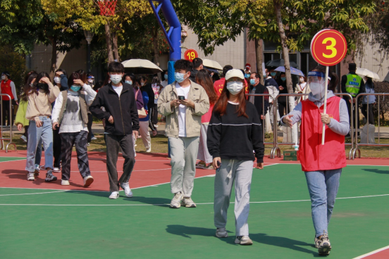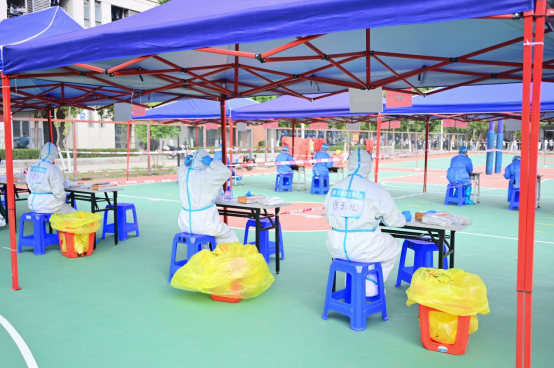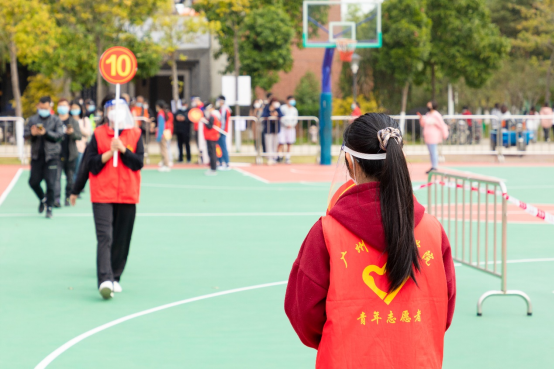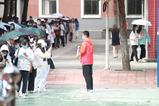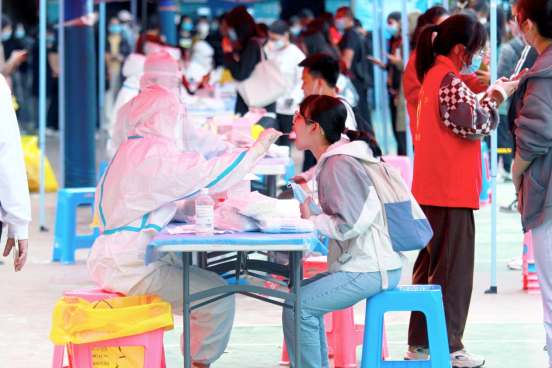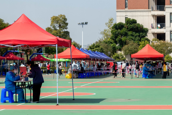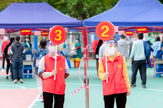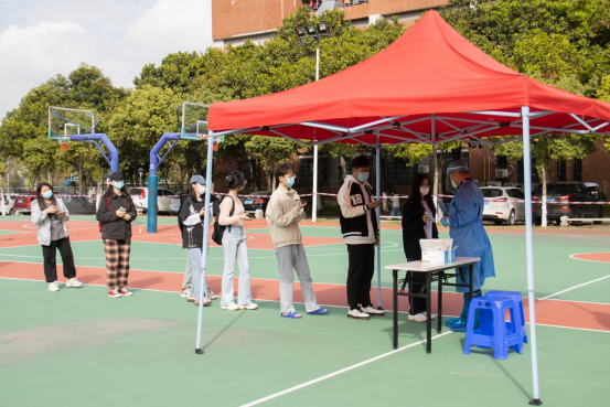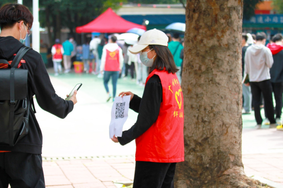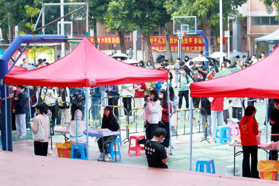 “请提前打开粤康码,戴好口罩。”“等候期间,请保持一米安全距离。”身穿红马甲的志愿者引导师生有序扫码、进场、检测、离场,确保采样工作有序高效进行。