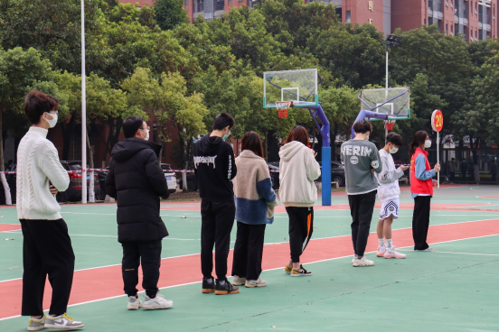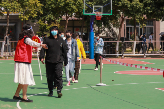 师生自觉佩戴口罩,分组排队、分批进入,场地标识黄色地标线,师生保持安全距离