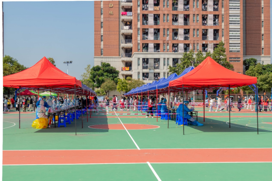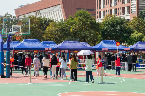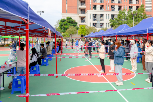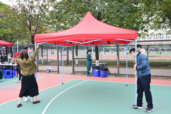 核酸采样现场设置单向进出口,标识“一米线”,并设“10+1”个摊位,为有虎门或常平旅居史的师生分设专用通道,确保检测流程安全有序。